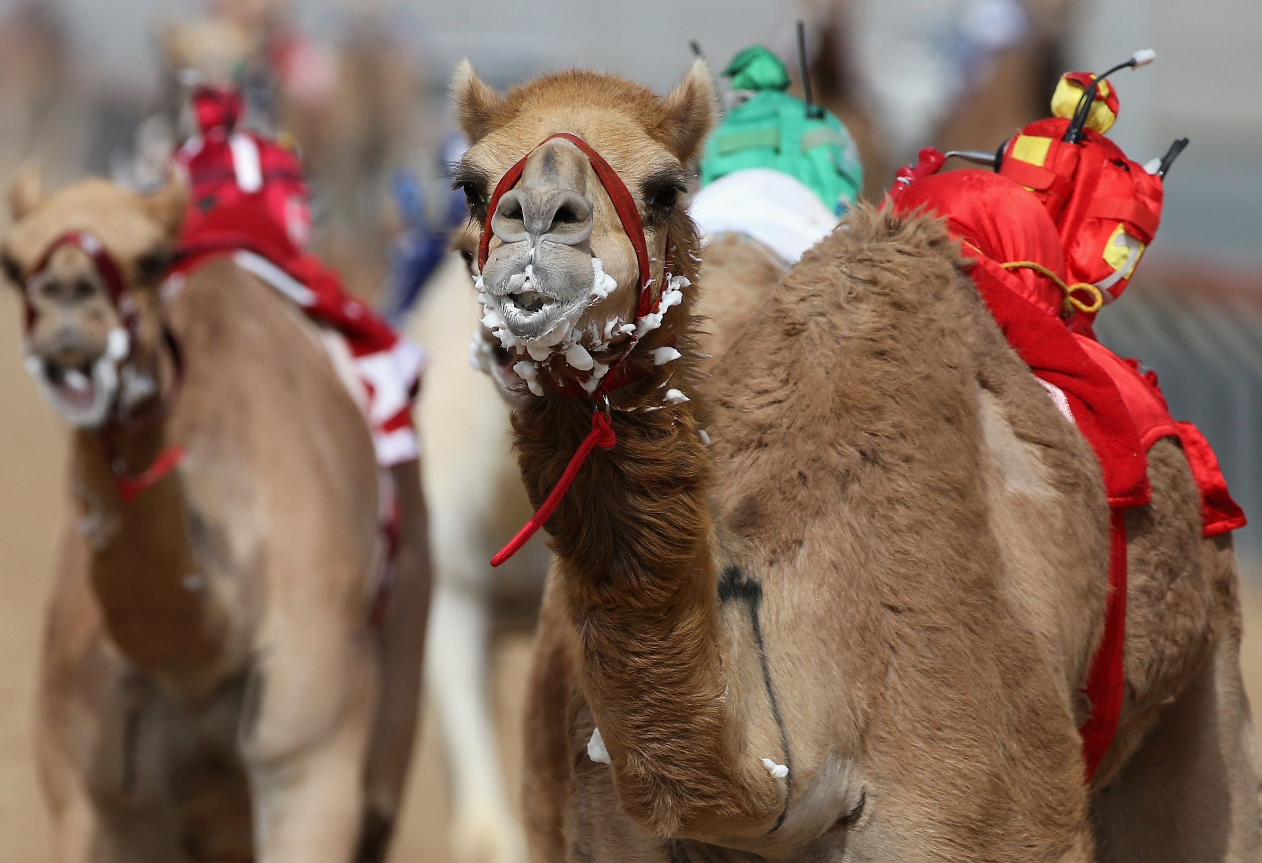 Unta ditunggangi oleh robot joki di Festival Marmoon 16 April 2014 di Dubai, Uni Emirat Arab.